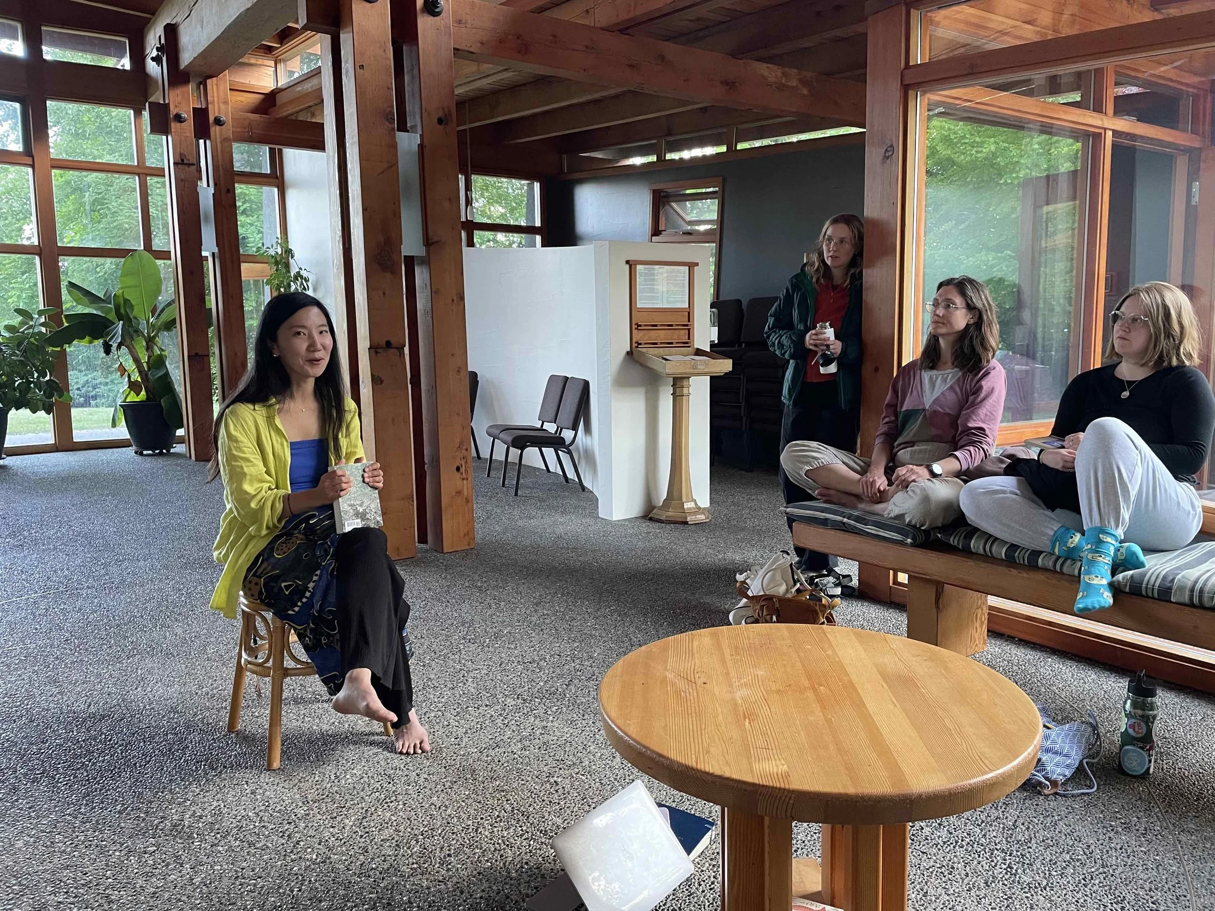 As a representative of unlearning space, Yo-E introduced an experimental workshop format titled bre-a-thing-r-oo-m, through which she shared ongoing artistic and research practices developed in Jeju Island. Grounded in collaborative inquiries into the “breathing body” and the “listening body,” developed through consultations and research across fields such as music and choreography, the workshop combined bodily experimentation and conversation to explore subtle relationships between breath, sound, and movement. Together with participants, we examined how breathing can extend beyond individual sensation to become a collective rhythm and a language of relation, continuously adjusted and adapted in response to the specific context of the site.